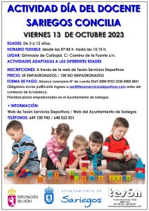 El viernes día 13 de octubre nuestros vecinos más pequeños se tomarán un pequeño descanso de sus estudios por el Día del Docente. Por ello, el Ayuntamiento de Sariegos y Tesón Servicios Deportivos han organizado una ludoteca infantil en la que pasarlo en grande con juegos, animaciones y mucho más mientras padres y madres trabajan.