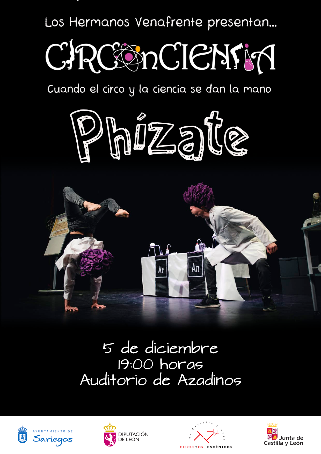 Llega a su fin la programación de Circuitos Escénicos 2025 de Castilla y León, con la inestimable colaboración del Instituto Leonés de Cultura y la Diputación de León, con el divertidísimo espectáculo «Phízate», que funde el circo, el humor y la ciencia, para grandes y pequeños. ¡Nadie está a salvo de los experimentos de Aurora Ribosoma y Armando Neutrino!